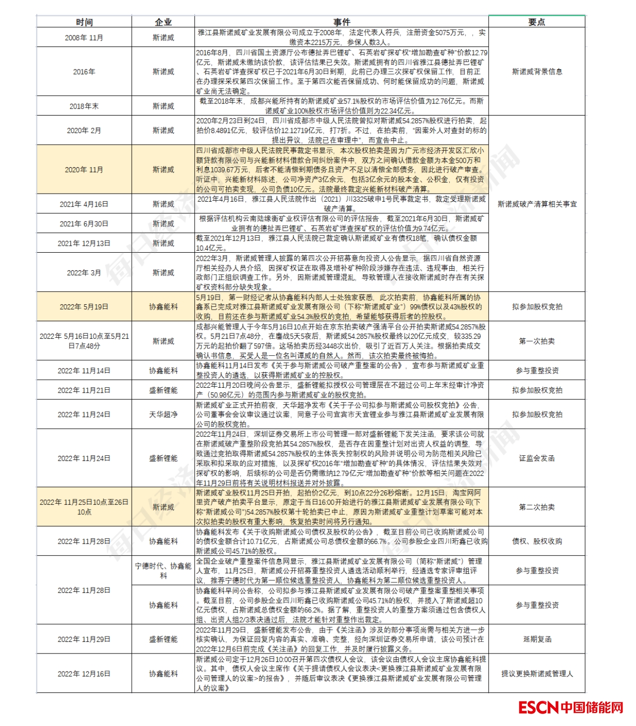 從去年5月16日首次拍賣至今,據(jù)梳理,真正重兵投入斯諾威爭奪戰(zhàn)的只有寧德時代、協(xié)鑫系和盛屯系三方。囿于實力所限,其余知名或不知名的勢力只能“作壁上觀”。