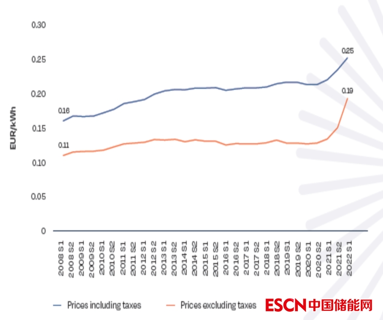 隨著全球經(jīng)濟(jì)在新冠疫情導(dǎo)致的放緩后恢復(fù)增長,對能源的需求也有所增長,導(dǎo)致包括電力在內(nèi)的價格大幅上漲。這種增長也反映在家庭應(yīng)用上。歐洲平均電價在2021年首次超過0.19歐元/kWh,并在全年持續(xù)增長。2022年2月發(fā)生的俄烏沖突導(dǎo)致了歐洲大陸出現(xiàn)能源危機(jī),隨著沖突的持續(xù),2022年電價趨勢加速至新的高度(見圖1.1)。