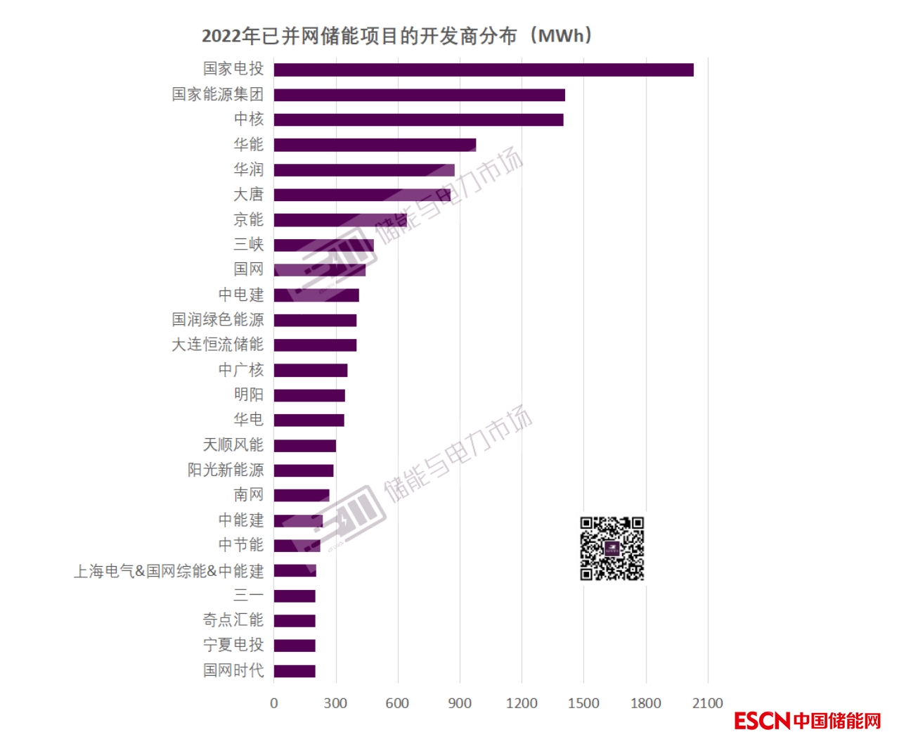 2022年已并網(wǎng)投運(yùn)的儲能項目來自近70家開發(fā)商。國電投、國家能源集團(tuán)、中核、華能、華潤、大唐、京能、三峽、國網(wǎng)、中電建等央企開發(fā)商獨(dú)領(lǐng)風(fēng)騷,牢牢地守住了排行榜的前十位。