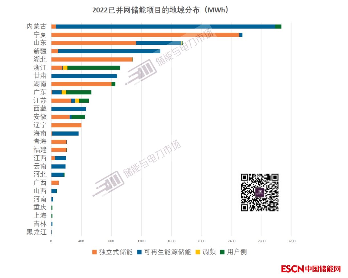 2022年投運(yùn)的儲能項目共計分布在26個省市自治區(qū)。從各地儲能項目的應(yīng)用場景來看,呈現(xiàn)了可再生能源儲能和獨(dú)立式儲能此消彼長、交相輝映的特點(diǎn)。