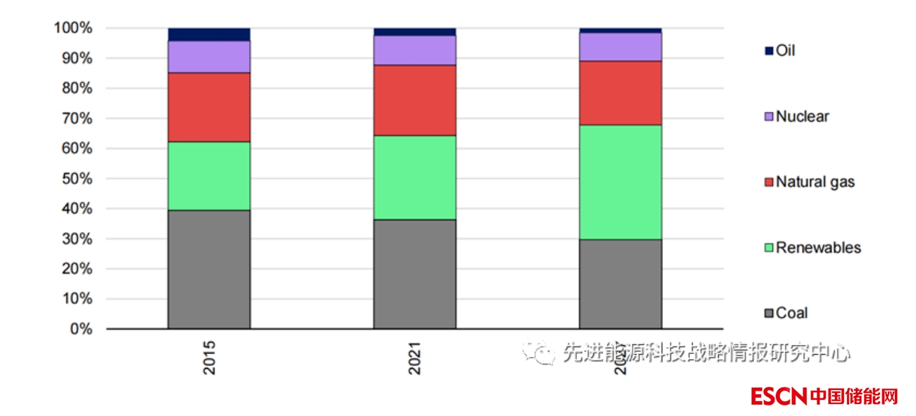 圖3 2015年、2021年和2027年全球電力結(jié)構(gòu)發(fā)展趨勢(shì)