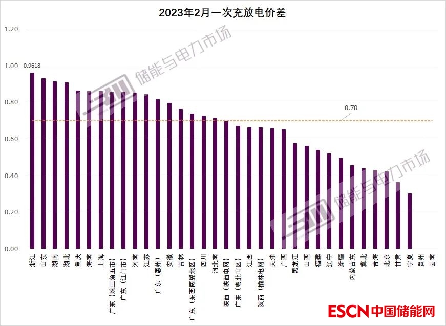 部分地區(qū)在冬季實施的尖峰電價,隨著用電緊張程度的減輕,2月份不再實施,因此峰谷價差超過0.7元/kWh的地區(qū)數(shù)量下降為17個,較1月份25個,減少32%;