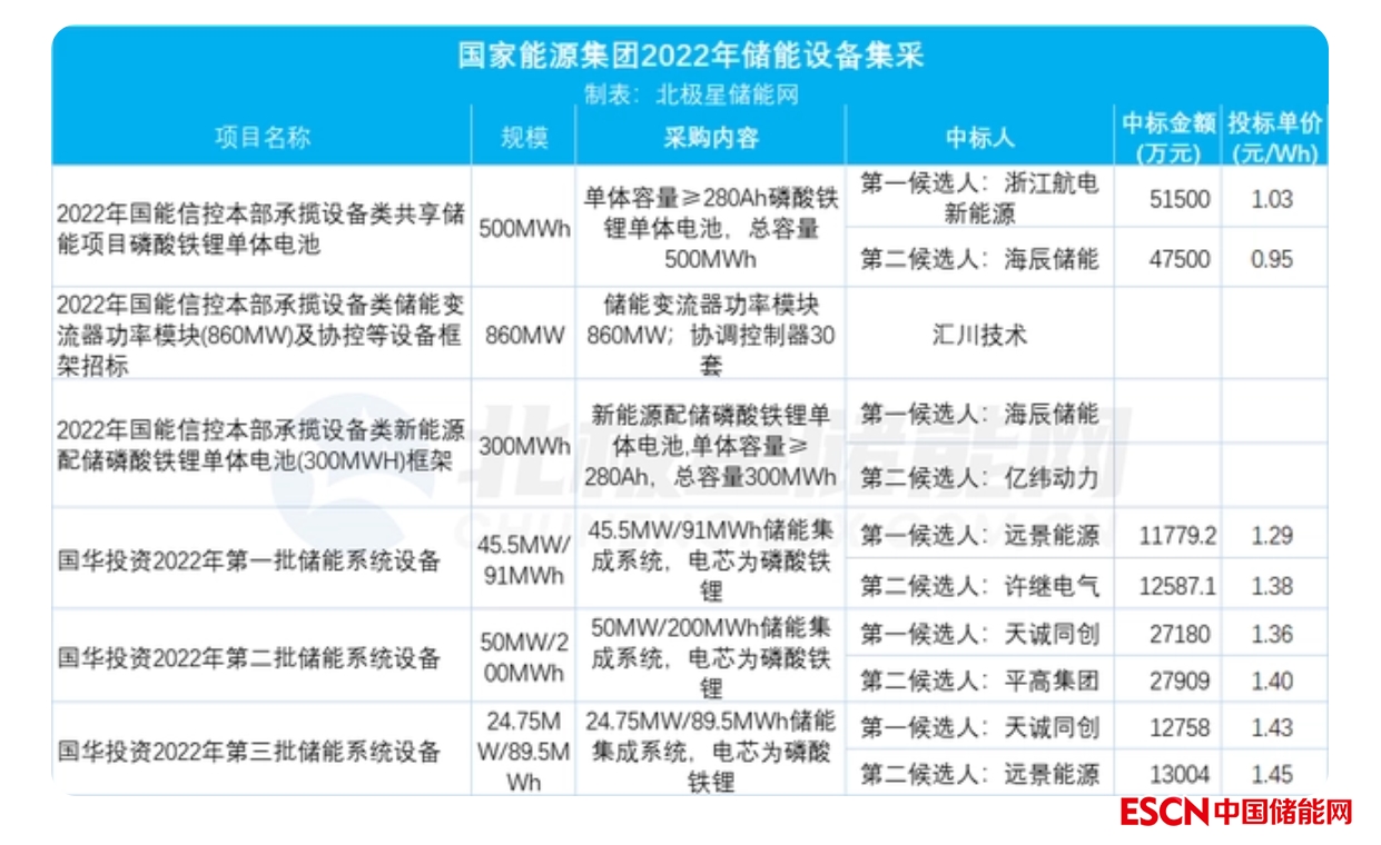 2022年以來,國家能源集團已開標多個儲能系統(tǒng)設備集采,總規(guī)模達1.18GWh。吸引海辰、平高、遠景、許繼、天誠同創(chuàng)等眾多有實力的企業(yè)參與競標。