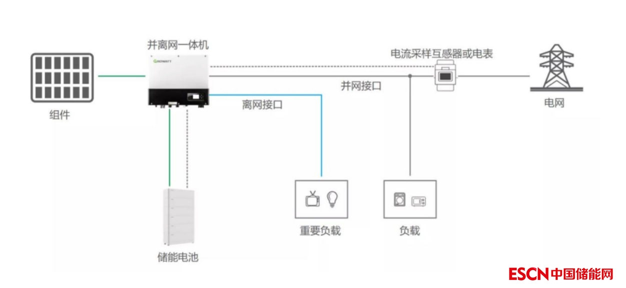 并離網(wǎng)系統(tǒng)的特點是既可以并網(wǎng)運行,也可以在電網(wǎng)斷電時單獨運行為重要負(fù)載供電。適用于電力系統(tǒng)不穩(wěn)定、自發(fā)自用不能上網(wǎng)、自用電價比上網(wǎng)電價貴等應(yīng)用場景。系統(tǒng)一般由太陽電池組件組成的光伏方陣、并離網(wǎng)一體機(jī)、蓄電池組、負(fù)載、電網(wǎng)等構(gòu)成。