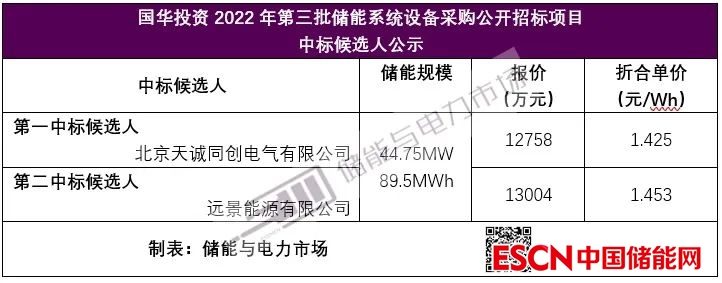 中國(guó)儲(chǔ)能網(wǎng)訊:國(guó)華投資2022年第三批儲(chǔ)能系統(tǒng)設(shè)備采購(gòu)公開(kāi)招標(biāo)項(xiàng)目發(fā)布了中標(biāo)候選人公示。北京天誠(chéng)同創(chuàng)電氣有限公司以總報(bào)價(jià)12758萬(wàn)元,折合單價(jià)1.425 元/Wh,成為第一中標(biāo)候選人。中標(biāo)候選人情況如下表所示: