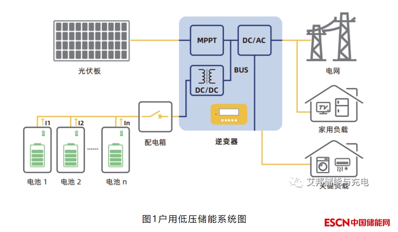 戶用低壓儲能系統(tǒng)是指電池電壓范圍40~60V的儲能系統(tǒng),由若干個電池并聯(lián)后連接到逆變器,經(jīng)逆變器內(nèi)部的隔離DC-DC,在母線處與光伏MPPT輸出的直流電交匯耦合,最終通過逆變輸出轉(zhuǎn)化為交流電并網(wǎng),部分逆變器具備有后備輸出功能。