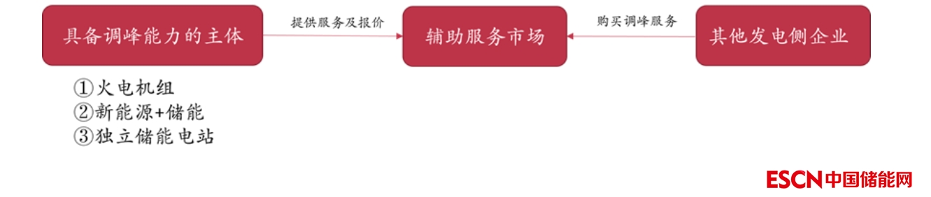 發(fā)電側(cè)提供調(diào)峰服務(wù),在電力輔助服務(wù)市場進(jìn)行交易;收益來源:市場化交易