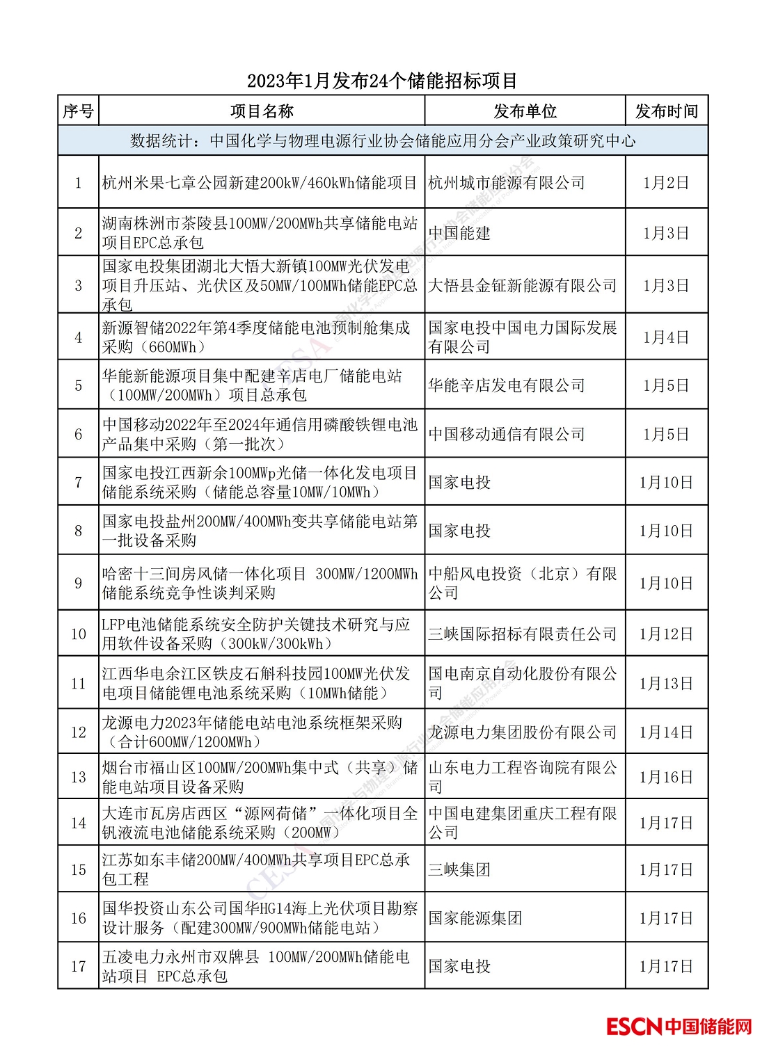 共計(jì)2.98GW/6.93GWh!2023年1月份發(fā)布24個(gè)儲能招標(biāo)項(xiàng)目