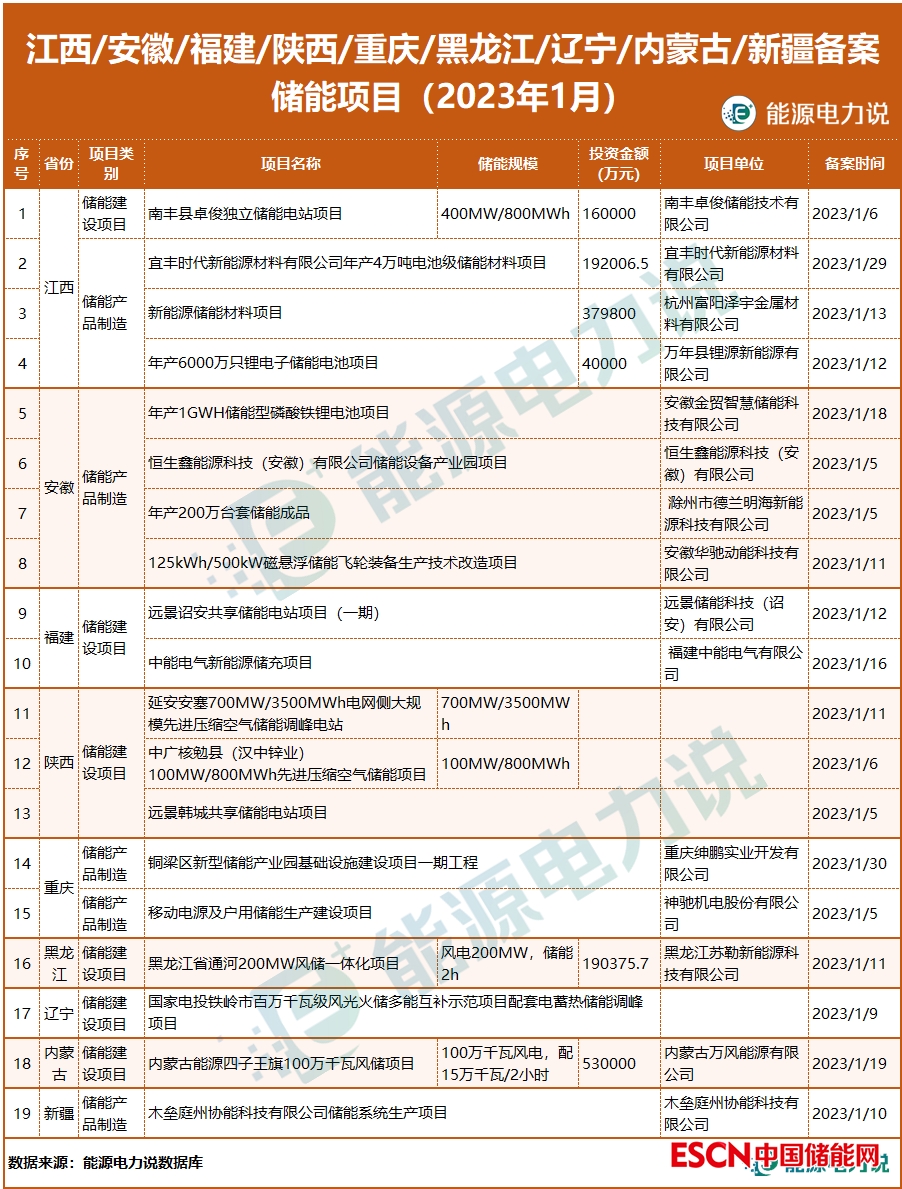 1月,江西、安徽、福建、陜西等多省均有備案儲能項目如下: