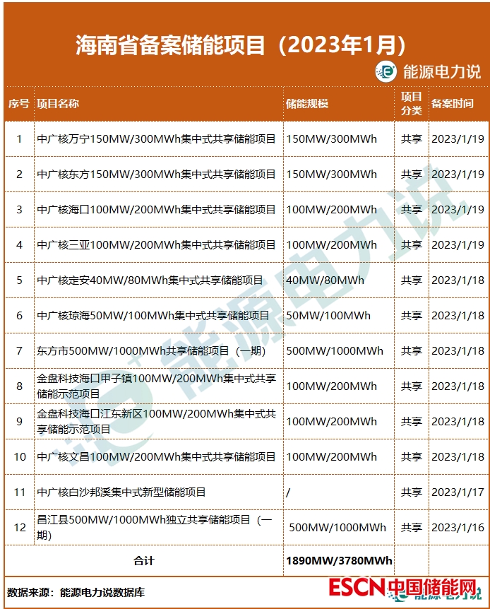 1月,海南省備案儲能項目12個,總規(guī)模約1890MW/3780MWh,均為共享儲能項目,儲能配置時長均為2小時。