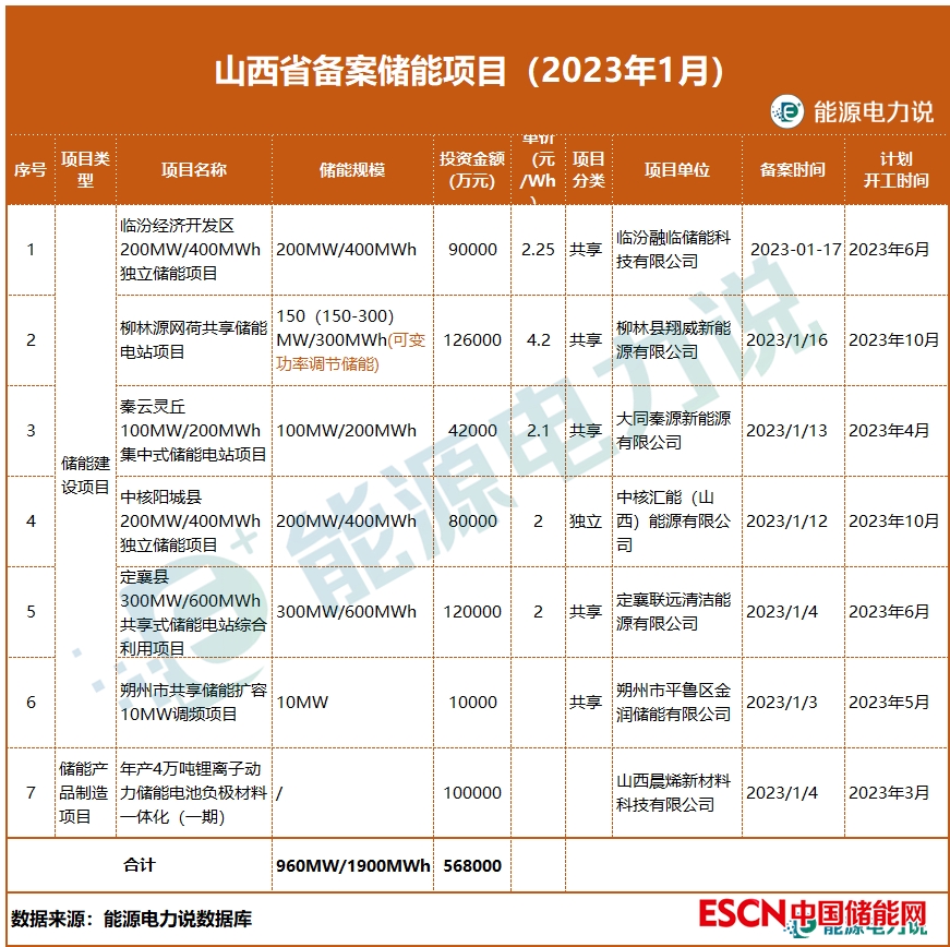 1月,山西省備案儲能項目7個,其中儲能建設項目6個;儲能產(chǎn)品制造項目1個,為儲能電池負極材料制造項目。