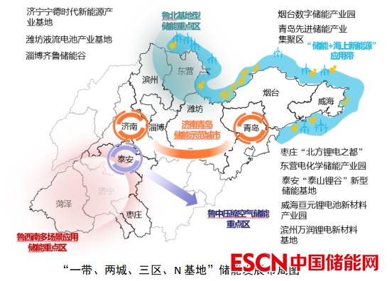 此外,《山東省新型儲能工程發(fā)展行動方案》也明確山東在新型儲能領域的六大重點任務:1)打造“儲能+海上新能源”應用帶,到2025,建設新型儲能項目100萬千瓦;2)建設濟南、青島儲能示范城市,到2025,新型儲能規(guī)模達到50萬千瓦;3)構建魯北基地型儲能重點區(qū),到2025,建設新型儲能項目270萬千瓦;4)構建魯中先進壓縮空氣儲能重點區(qū),到2025,建成壓縮空氣儲能項目30萬千瓦以上;5)構建魯西南多場景應用儲能重點區(qū),到2025,建設新型儲能項目50萬千瓦;6)打造一批上下協(xié)同、各具特色的配套產(chǎn)業(yè)基地,在棗莊、東營等市,重點發(fā)展原材料產(chǎn)業(yè);在青島、濟寧等市,重點發(fā)展設備制造產(chǎn)業(yè);在濟南、煙臺等市,重點發(fā)展儲能集成產(chǎn)業(yè);在淄博重點發(fā)展相關服務產(chǎn)業(yè)。