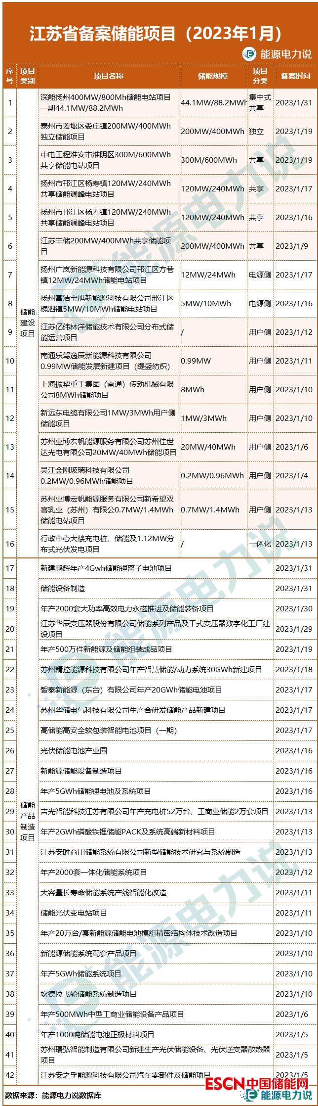 1月,江蘇省備案儲能項目42個,其中儲能建設項目16個,儲能產(chǎn)品制造項目26個。