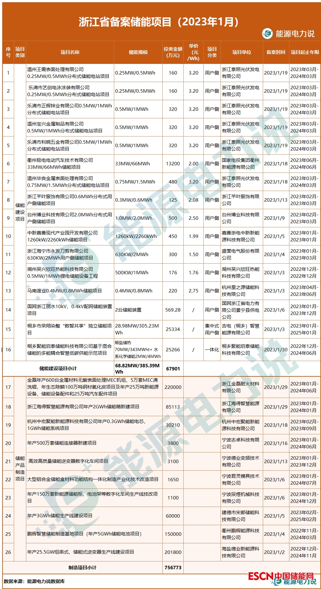 1月,浙江省備案儲能項目26個,其中儲能建設項目16個,以工商業(yè)用戶側儲能項目為主;儲能產(chǎn)品制造基地項目10個,涉及儲能電池、儲能逆變器、儲能箱、儲能連接器、儲能柜等產(chǎn)能建設規(guī)劃。