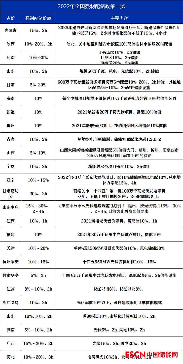 中國儲(chǔ)能網(wǎng)訊:根據(jù)各省下發(fā)的保障性并網(wǎng)、市場化并網(wǎng)新能源項(xiàng)目申報(bào)要求,配儲(chǔ)的最低比例如下表。實(shí)際上,在大多數(shù)省份,項(xiàng)目要想獲得規(guī)模指標(biāo),實(shí)際的配儲(chǔ)比例均高于下表。