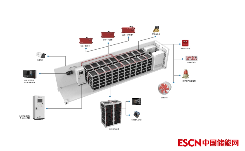 中大型電化學儲能系統(tǒng)消防解決方案由探測報警系統(tǒng)和滅火系統(tǒng)兩個子系統(tǒng)組成,其中探測報警系統(tǒng)主要包括儲能電站用氫氣、一氧化碳、VOC和感煙感溫復合火災探測裝置、儲能電站火災報警控制裝置;滅火系統(tǒng)主要包括電化學儲能艙火災抑制裝置、簇級電磁閥、電池箱專用噴頭等。電化學儲能艙火災抑制方案以“早發(fā)現(xiàn),早處置”為原則, 在熱失控初級階段進行預警和精準抑制處理,將電化學儲能艙的損失盡可能減小。
