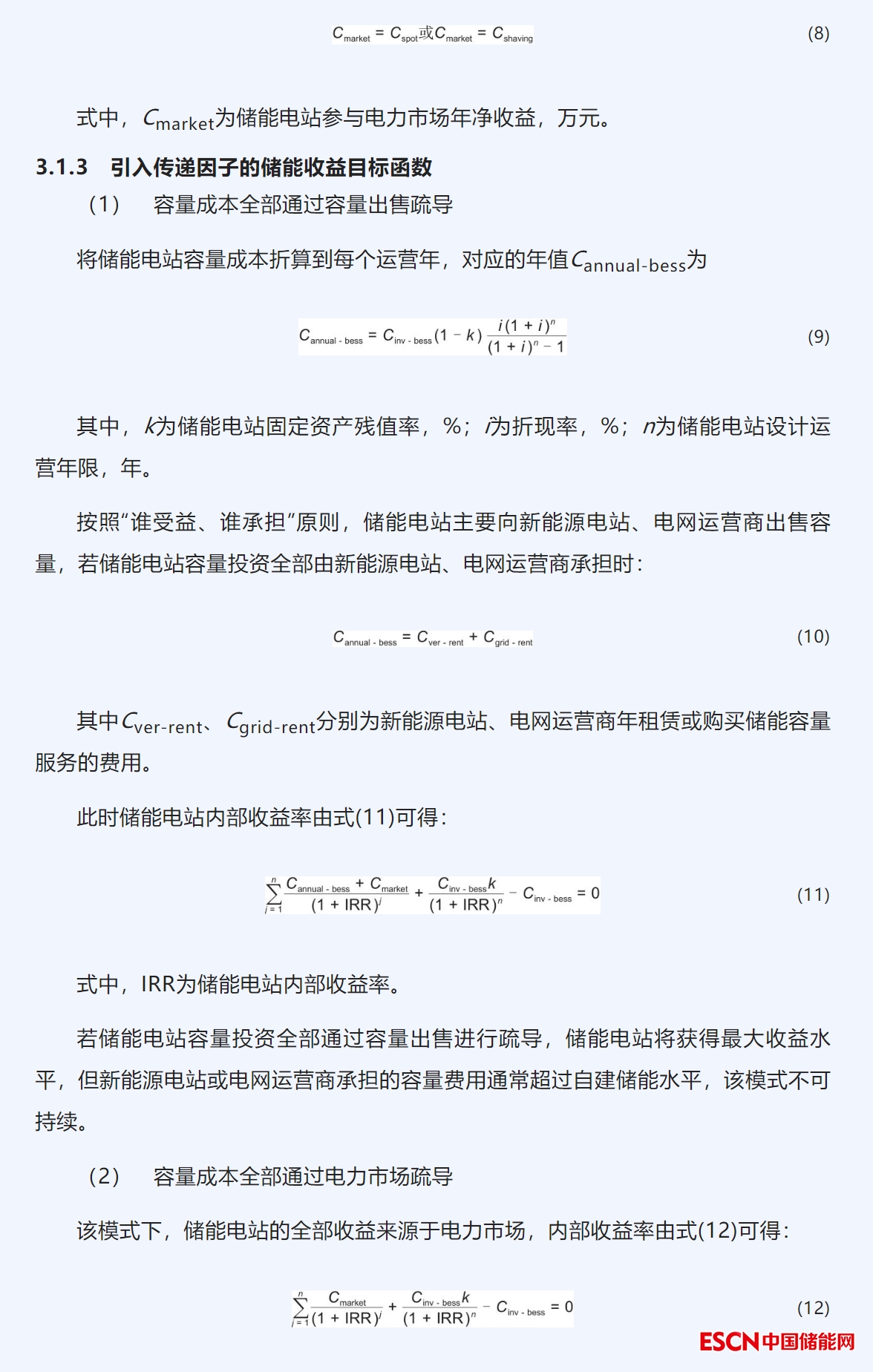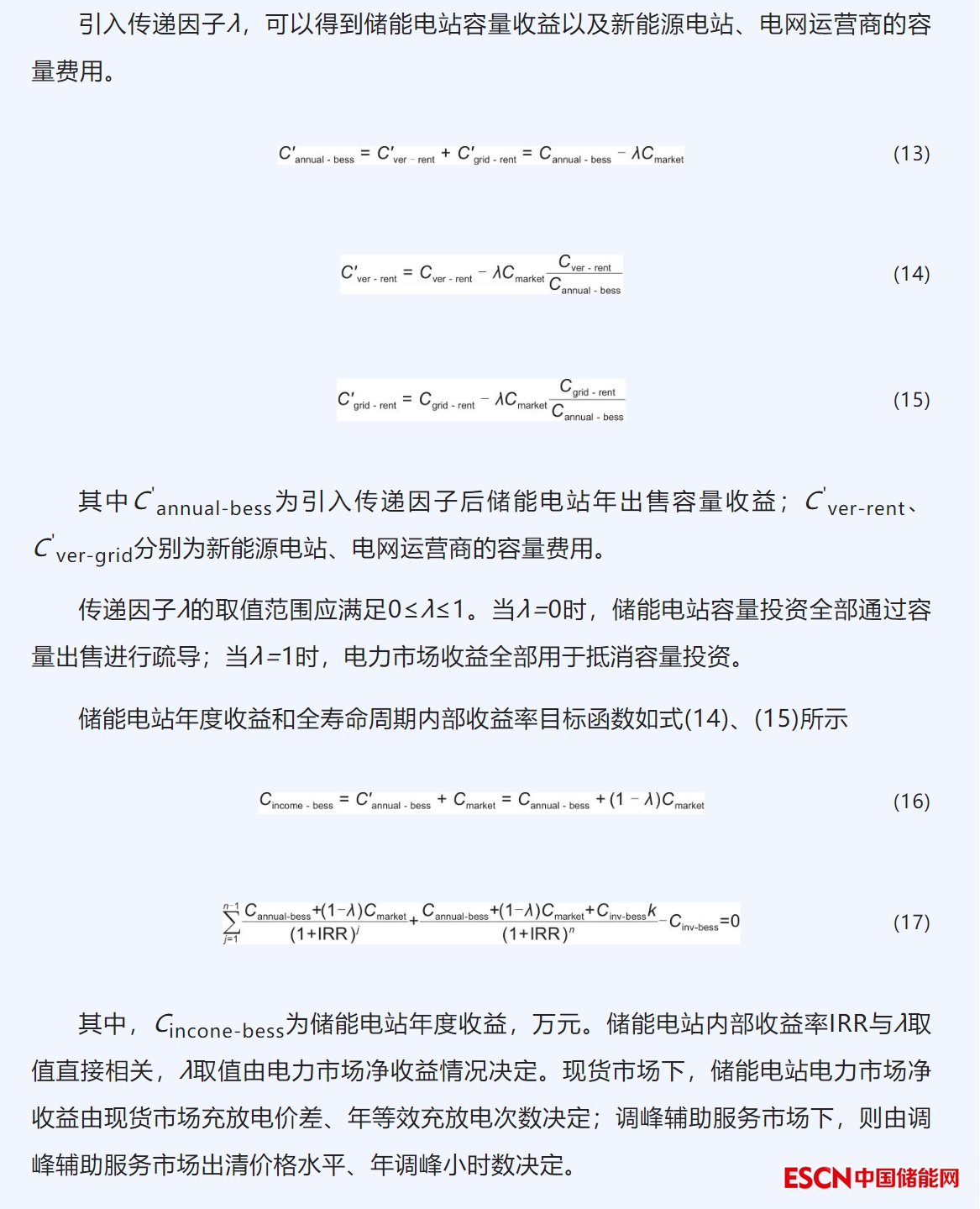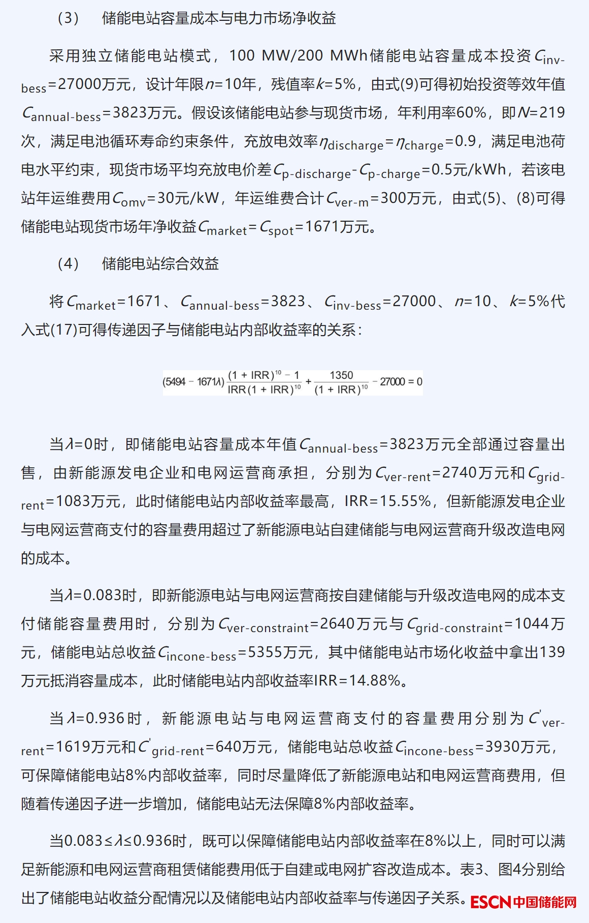 本文研究了獨(dú)立新型儲(chǔ)能電站的價(jià)格形成機(jī)制及成本疏導(dǎo)方法。通過(guò)總結(jié)國(guó)內(nèi)外儲(chǔ)能電站價(jià)格形成機(jī)制的實(shí)踐經(jīng)驗(yàn),分析得出在能源轉(zhuǎn)型與電力市場(chǎng)深化改革“雙期”疊加階段,政府兩部制定價(jià)模式和獨(dú)立參與電力市場(chǎng)均難以支撐儲(chǔ)能電站大規(guī)模商業(yè)化應(yīng)用。本文提出了基于傳遞因子的容量出售與市場(chǎng)收益相結(jié)合的儲(chǔ)能電站價(jià)格形成機(jī)制,以及多利益主體的成本疏導(dǎo)優(yōu)化分配方法可為當(dāng)前儲(chǔ)能電站商業(yè)化應(yīng)用提供一種思路。案例結(jié)果顯示,當(dāng)傳遞因子處于0.083到0.936范圍內(nèi),可以有效分配儲(chǔ)能容量收益和市場(chǎng)收益,保障儲(chǔ)能自身合理的收益水平并實(shí)現(xiàn)多利益主體之間的效益平衡。