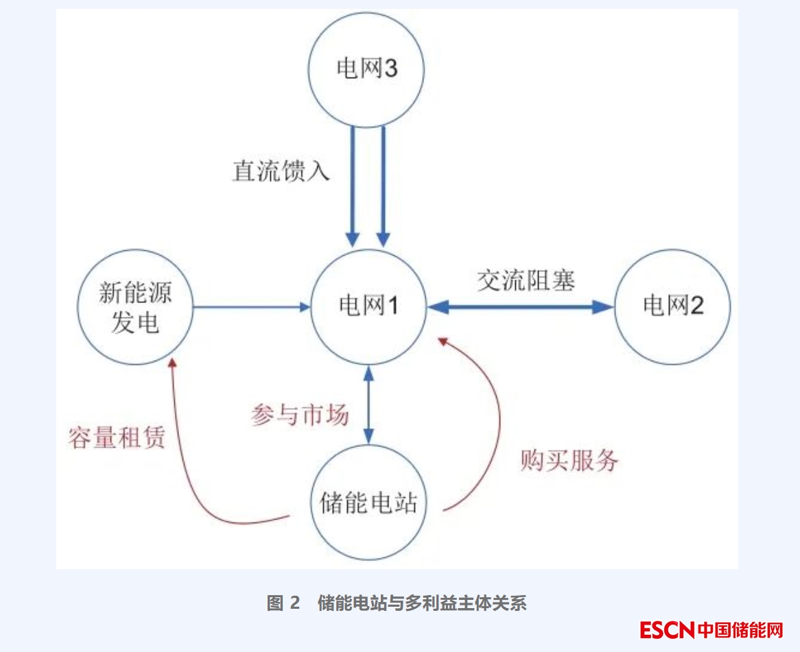 責(zé)權(quán)利的統(tǒng)一是儲(chǔ)能電站成本疏導(dǎo)的關(guān)鍵。圖2所示為新能源電站、電網(wǎng)運(yùn)營(yíng)商、儲(chǔ)能電站開(kāi)發(fā)商的關(guān)系圖,對(duì)于調(diào)峰資源不足的地區(qū),新建新能源電站需要承擔(dān)新增調(diào)峰能力的建設(shè)成本,如儲(chǔ)能的容量投資;因高比例新能源、高比例電力電子裝備并網(wǎng)產(chǎn)生的系統(tǒng)頻率、電壓等涉及全網(wǎng)安全穩(wěn)定問(wèn)題,應(yīng)由電力系統(tǒng)承擔(dān)儲(chǔ)能容量服務(wù)費(fèi)用;因提升電網(wǎng)輸送能力、緩解阻塞,有效替代新建擴(kuò)建輸配電設(shè)施,相關(guān)儲(chǔ)能服務(wù)成本應(yīng)在監(jiān)審要求下通過(guò)輸配電價(jià)疏導(dǎo)。從承擔(dān)能力上看,新能源電站、電網(wǎng)運(yùn)營(yíng)商自建儲(chǔ)能一次性投資大,政策風(fēng)險(xiǎn)高,儲(chǔ)能利用具有不定時(shí)、不定量等特點(diǎn),多為備用狀態(tài),利用率不高。相比而言,通過(guò)租賃或購(gòu)買(mǎi)儲(chǔ)能容量服務(wù)年運(yùn)營(yíng)資金小,政策風(fēng)險(xiǎn)低,儲(chǔ)能電站既可以滿(mǎn)足新能源電站、電網(wǎng)運(yùn)營(yíng)商需求,也可以滿(mǎn)足電力系統(tǒng)運(yùn)行的需求。
