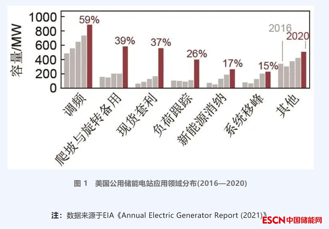 參與電力市場(chǎng)是歐美等國(guó)儲(chǔ)能應(yīng)用的主要形式,因此,市場(chǎng)定價(jià)也是主要的價(jià)格形成機(jī)制。儲(chǔ)能電站參與電能量市場(chǎng)(中長(zhǎng)期交易、現(xiàn)貨交易)、輔助服務(wù)市場(chǎng)(調(diào)頻、備用)、容量市場(chǎng),通過(guò)雙邊協(xié)商、集中競(jìng)價(jià)、集中撮合、拍賣(mài)等方式形成價(jià)格。電能量批發(fā)市場(chǎng)方面,美國(guó)主要ISO采取統(tǒng)一運(yùn)營(yíng)模式,日前、實(shí)時(shí)執(zhí)行全電量出清形成市場(chǎng)價(jià)格。英國(guó)儲(chǔ)能設(shè)施通過(guò)雙邊交易形成價(jià)格和電力曲線或通過(guò)集中競(jìng)價(jià)參與平衡市場(chǎng)。輔助服務(wù)市場(chǎng)方面,美國(guó)PJM、英國(guó)、澳大利亞等均推出了針對(duì)快速調(diào)頻資源的調(diào)頻輔助服務(wù)市場(chǎng)以提升系統(tǒng)頻率穩(wěn)定性,并突出了按效果付費(fèi)的補(bǔ)償機(jī)制。容量市場(chǎng)方面,美國(guó)PJM、英國(guó)主要通過(guò)競(jìng)價(jià)或拍賣(mài)方式形成容量?jī)r(jià)格,儲(chǔ)能由于受放電時(shí)長(zhǎng)的限制,均設(shè)定了容量補(bǔ)償系數(shù),儲(chǔ)能放電時(shí)長(zhǎng)越短系數(shù)越低。與此同時(shí),歐美等國(guó)均允許儲(chǔ)能電站可同時(shí)參與電能量、輔助服務(wù)和容量等多種市場(chǎng),提升了儲(chǔ)能盈利水平。美國(guó)能源信息署(Energy Information Administration,EIA)對(duì)截至2020年底美國(guó)公用儲(chǔ)能電站(容量大于1兆瓦)應(yīng)用領(lǐng)域進(jìn)行統(tǒng)計(jì),如圖1所示:約有885兆瓦(占公用事業(yè)規(guī)模電池總?cè)萘康?9%)用于頻率響應(yīng),583兆瓦(占比39%)用于爬坡或備轉(zhuǎn)容量,586兆瓦(占比37%)參與現(xiàn)貨市場(chǎng)。