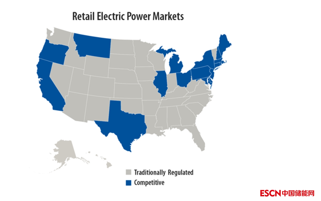 競爭性零售電力市場(藍(lán)色)允許電力消費(fèi)者在競爭性零售供應(yīng)商之間進(jìn)行選擇。這些電力市場已開放發(fā)電,以便與 24 個州(例如,加利福尼亞州、德克薩斯州和東北部的大多數(shù)州)的獨(dú)立電力生產(chǎn)商競爭。其中 18 個州和華盛頓特區(qū)還引入了零售選擇,允許住宅和/或工業(yè)消費(fèi)者選擇他們自己的電力供應(yīng)商和發(fā)電選項(xiàng),包括可再生能源。零售供應(yīng)合同的結(jié)構(gòu)、項(xiàng)目的位置和所選可再生能源的規(guī)模具有更大的靈活性。