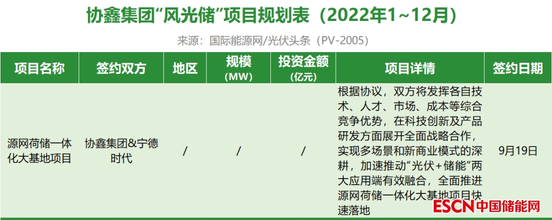 截至2022年12月31日,協(xié)鑫集團(tuán)共簽約(規(guī)劃)1個(gè)風(fēng)光儲(chǔ)項(xiàng)目,該項(xiàng)目?jī)H簽署了合作協(xié)議。