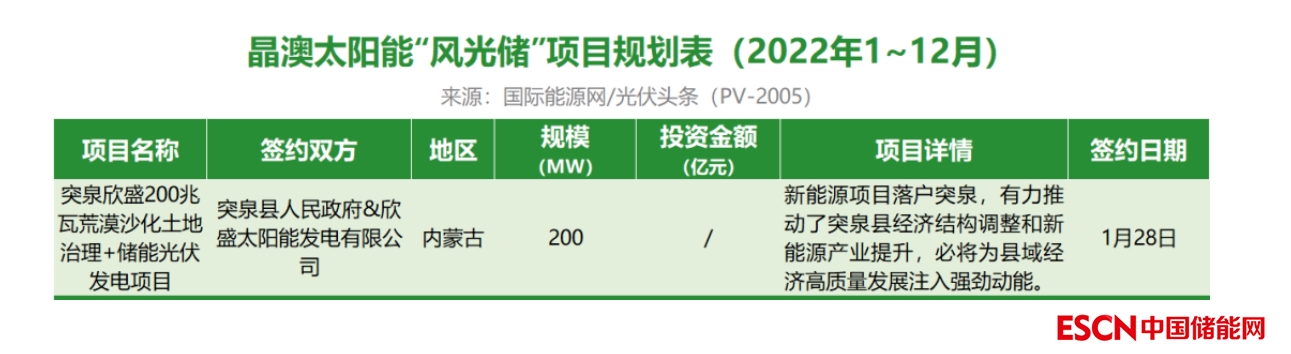截至2022年12月31日,晶澳太陽(yáng)能共簽約(規(guī)劃)1個(gè)風(fēng)光儲(chǔ)項(xiàng)目,項(xiàng)目規(guī)模為200MW。