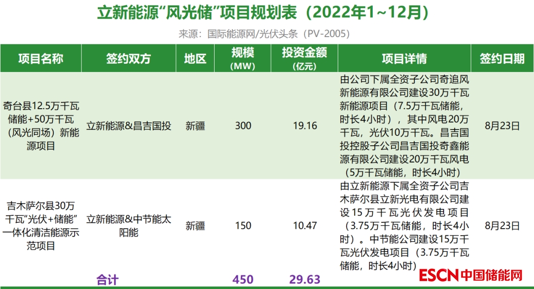 截至截至2022年12月31日,立新能源共簽約(規(guī)劃)2個(gè)風(fēng)光儲(chǔ)項(xiàng)目,其中已明確項(xiàng)目規(guī)模為450MW,投資金額為29.63億元。