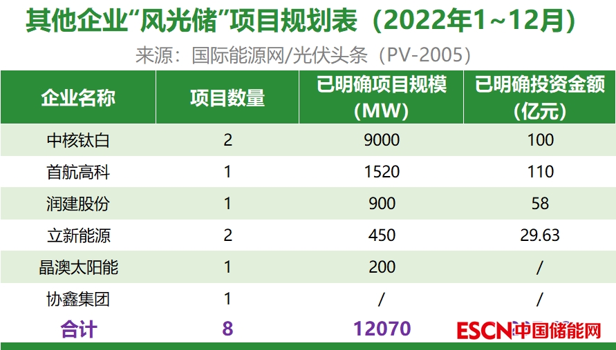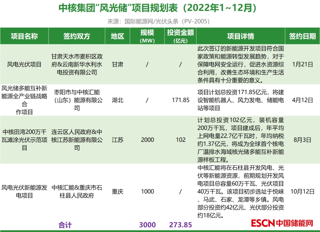截至2022年12月31日,中核集團(tuán)共簽約(規(guī)劃)4個(gè)風(fēng)光儲(chǔ)項(xiàng)目,明確規(guī)模共計(jì)3GW。其中有2個(gè)項(xiàng)目明確投資金額273.85億元。