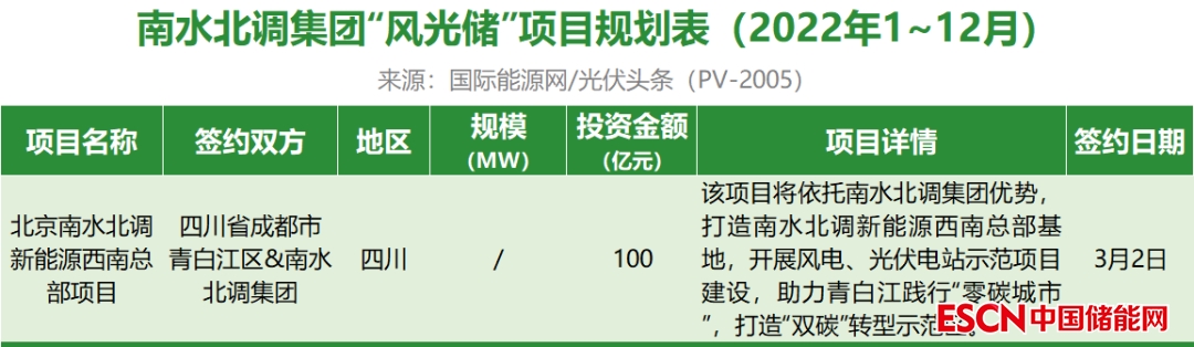 截至2022年12月31日,南水北調(diào)集團(tuán)共簽約(規(guī)劃)1個(gè)風(fēng)光儲(chǔ)項(xiàng)目,明確投資金額為100億元。
