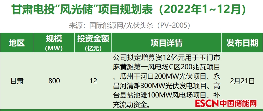 截至2022年12月31日,甘肅電投共規(guī)劃1個(gè)風(fēng)光儲(chǔ)項(xiàng)目,項(xiàng)目規(guī)模為800MW,投資金額12億元。