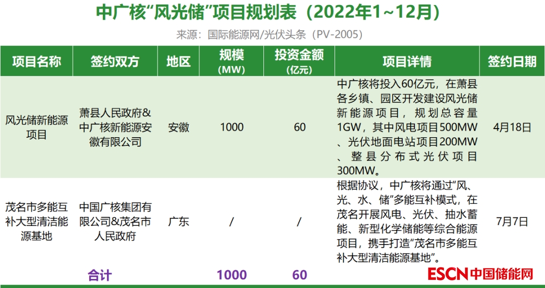 截至2022年12月31日,中廣核共簽約(規(guī)劃)2個(gè)風(fēng)光儲(chǔ)項(xiàng)目,其中已明確項(xiàng)目規(guī)模為1GW,有1個(gè)項(xiàng)目明確投資金額60億元。