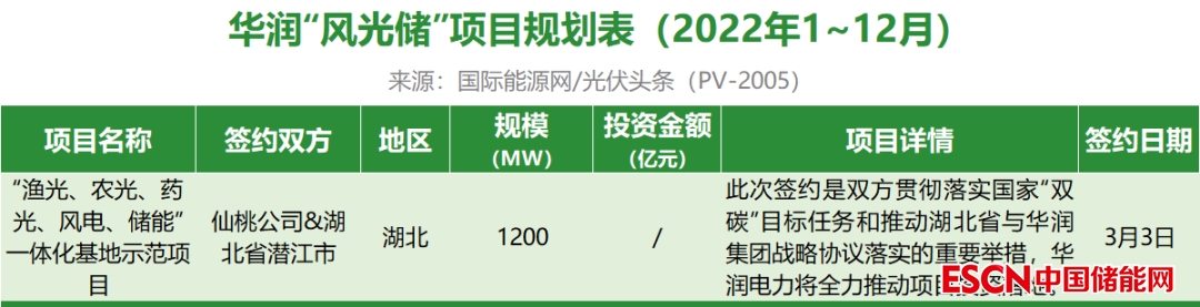 截至2022年12月31日,華潤(rùn)共簽約(規(guī)劃)1個(gè)風(fēng)光儲(chǔ)項(xiàng)目,項(xiàng)目規(guī)模1.2GW。
