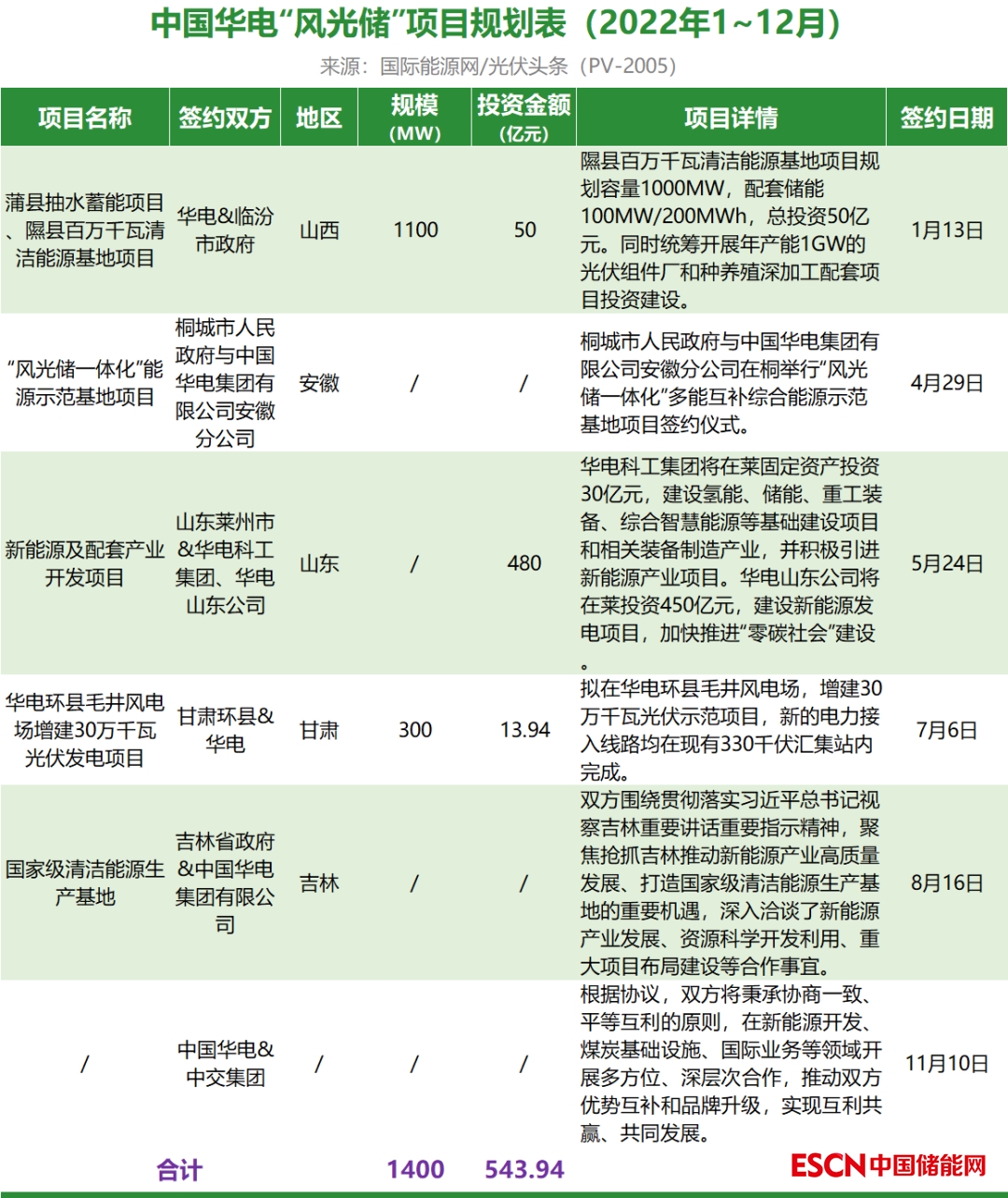截至2022年12月31日,華電共簽約(規(guī)劃)6個(gè)風(fēng)光儲(chǔ)項(xiàng)目,其中已明確項(xiàng)目規(guī)模為1.4GW,有3個(gè)項(xiàng)目明確投資金額為543.94億元。
