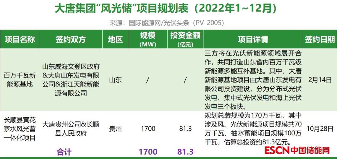截至2022年12月31日,大唐集團(tuán)共簽約(規(guī)劃)2個(gè)風(fēng)光儲(chǔ)項(xiàng)目,明確規(guī)模共計(jì)1.7GW,明確投資金額81.3億元。