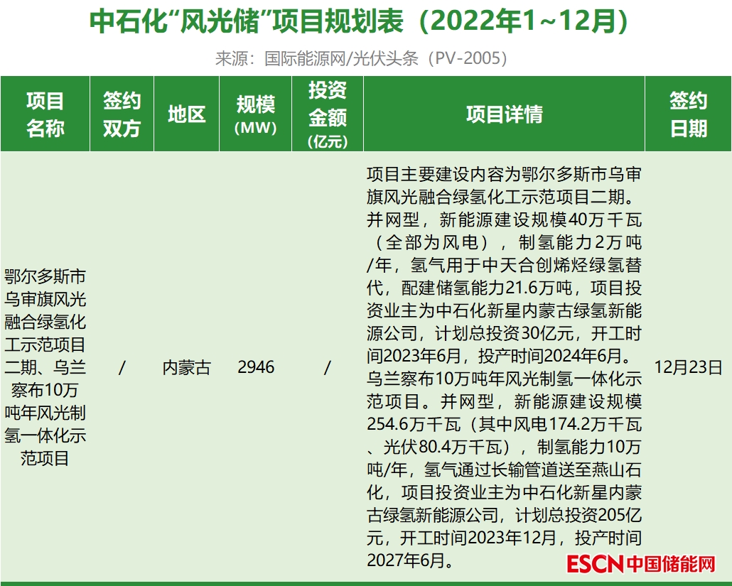 截至2022年12月31日,中石化共簽約(規(guī)劃)1個(gè)風(fēng)光儲(chǔ)項(xiàng)目,明確規(guī)模共計(jì)2.946GW。