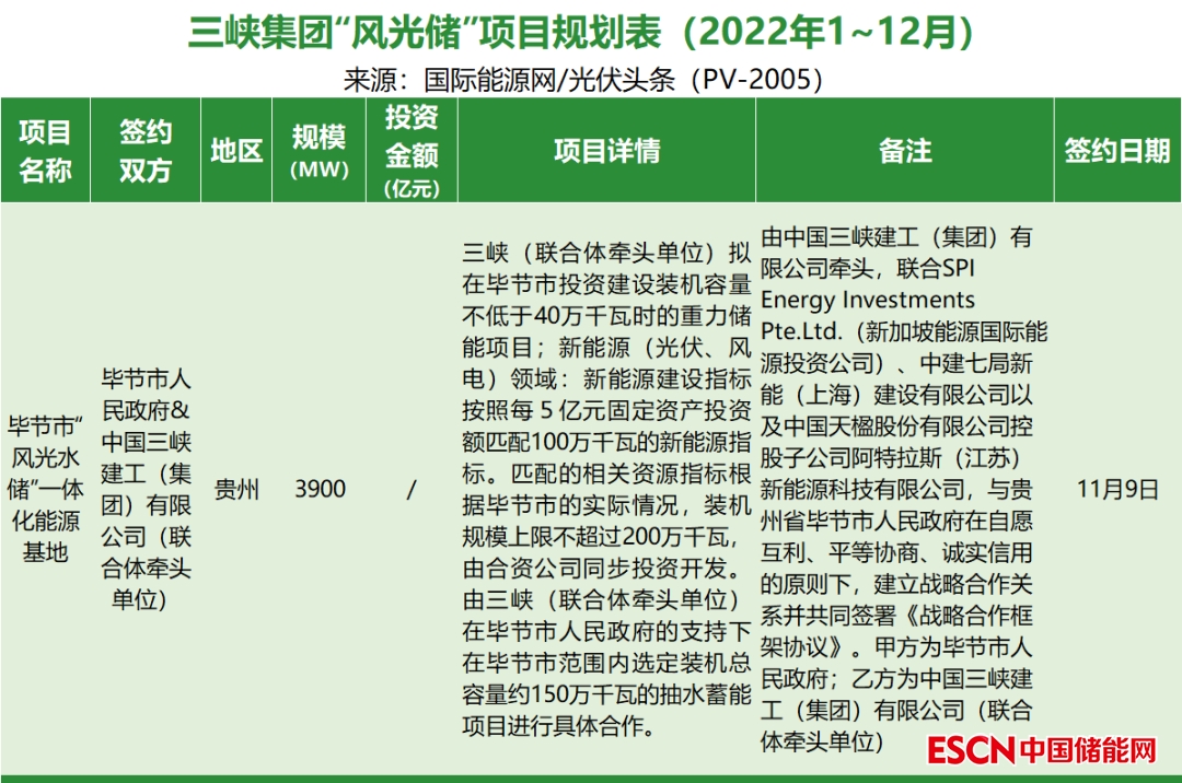 截至2022年12月31日,三峽集團(tuán)共簽約(規(guī)劃)1個(gè)風(fēng)光儲(chǔ)項(xiàng)目,明確規(guī)模共計(jì)3.9GW。