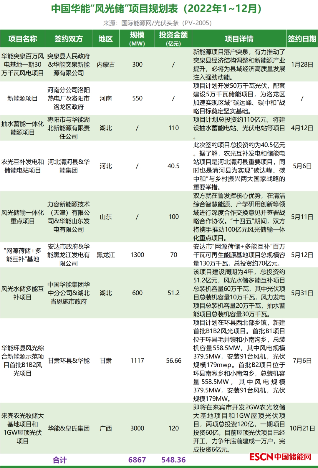 截至2022年12月31日,華能共簽約(規(guī)劃)9個(gè)風(fēng)光儲(chǔ)項(xiàng)目,明確規(guī)模共計(jì)6.867GW,有7個(gè)項(xiàng)目明確投資金額共計(jì)548.36億元。