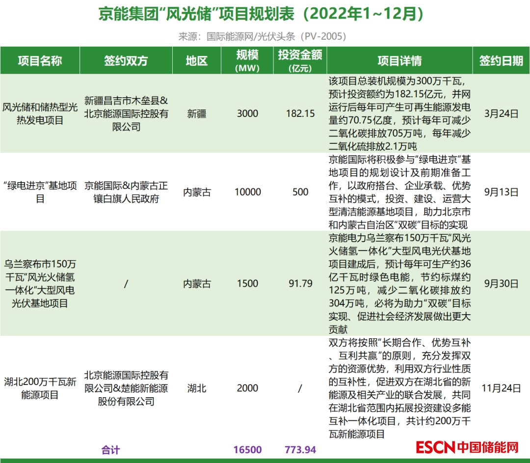截至2022年12月31日,京能集團(tuán)共簽約(規(guī)劃)4個(gè)風(fēng)光儲(chǔ)項(xiàng)目,項(xiàng)目規(guī)模16.5GW,投資金額773.94億元。