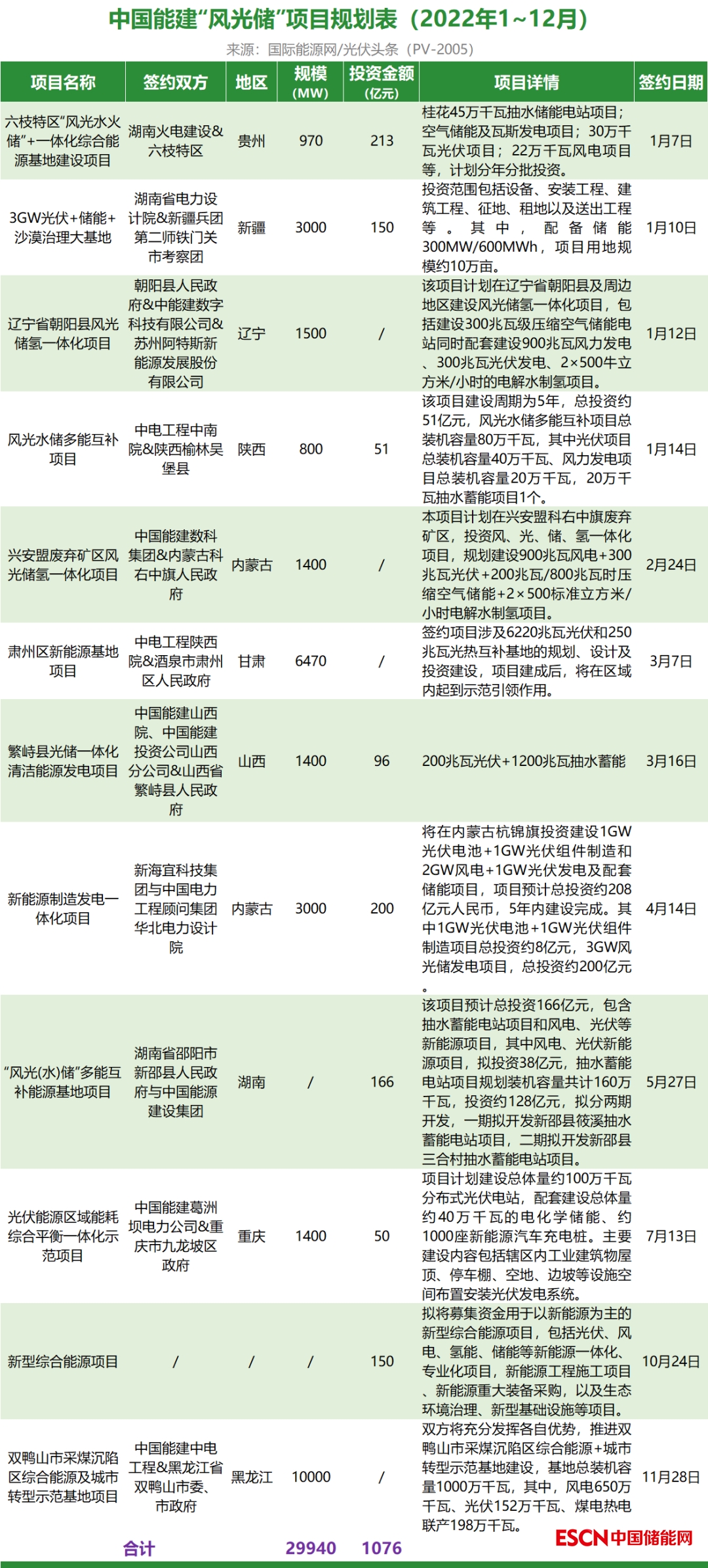 截至2022年12月31日,中國(guó)能建共簽約(規(guī)劃)12個(gè)風(fēng)光儲(chǔ)項(xiàng)目,明確項(xiàng)目規(guī)模共計(jì)29.94GW。此外,有8個(gè)項(xiàng)目明確投資金額,共1076億元。