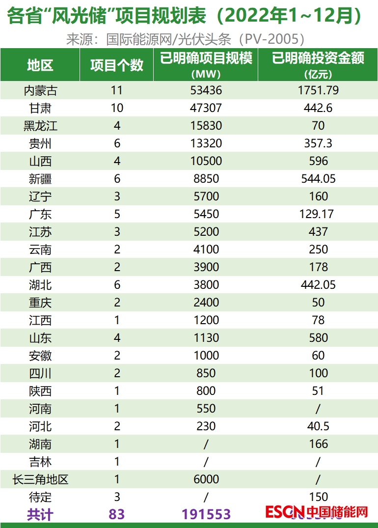 據(jù)國(guó)際能源網(wǎng)/光伏頭條(PV-2005)統(tǒng)計(jì),2022年全國(guó)共簽約/規(guī)劃風(fēng)光儲(chǔ)項(xiàng)目83個(gè),已明確的項(xiàng)目規(guī)模為191.553GW,已明確的投資金額為6633.46億元。