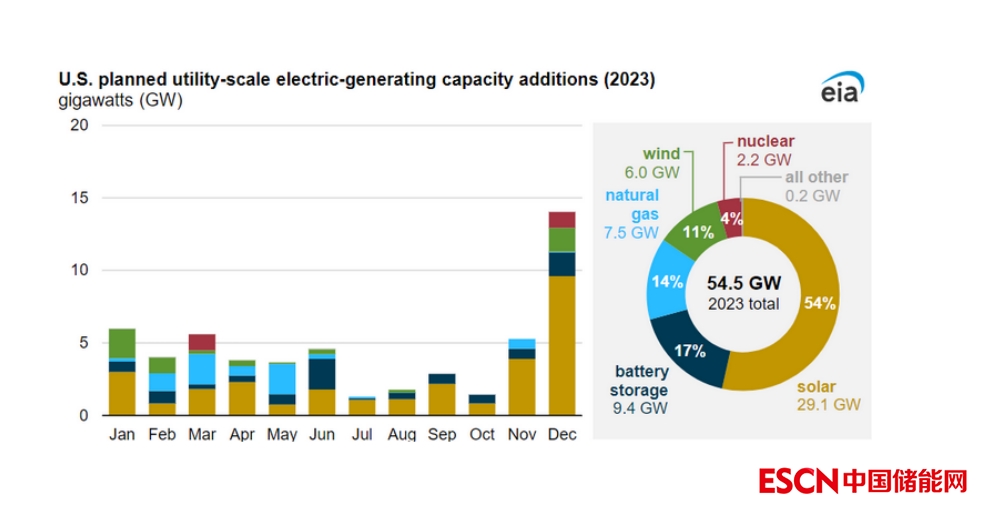 在2023年美國(guó)計(jì)劃新增的發(fā)電資產(chǎn)中,電池儲(chǔ)能系統(tǒng)占17%,太陽(yáng)能發(fā)電設(shè)施占54%。
