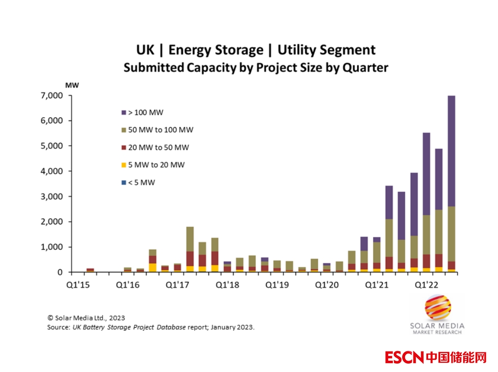 2022年第三季度提交的電池儲能項目規(guī)劃中有一半以上(7GW中的4.4GW)是100MW以上電池儲能系統(tǒng),而在此期間提交的儲能項目(7GW的6.5GW)幾乎都是50MW以上電池儲能系統(tǒng)。