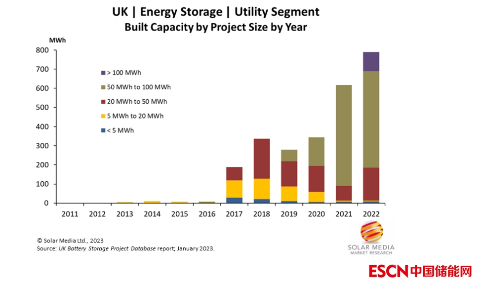 調(diào)查表明,英國在2022年部署的儲能系統(tǒng)儲能容量增加了近800MWh,這是迄今為止最高的年度部署數(shù)字。