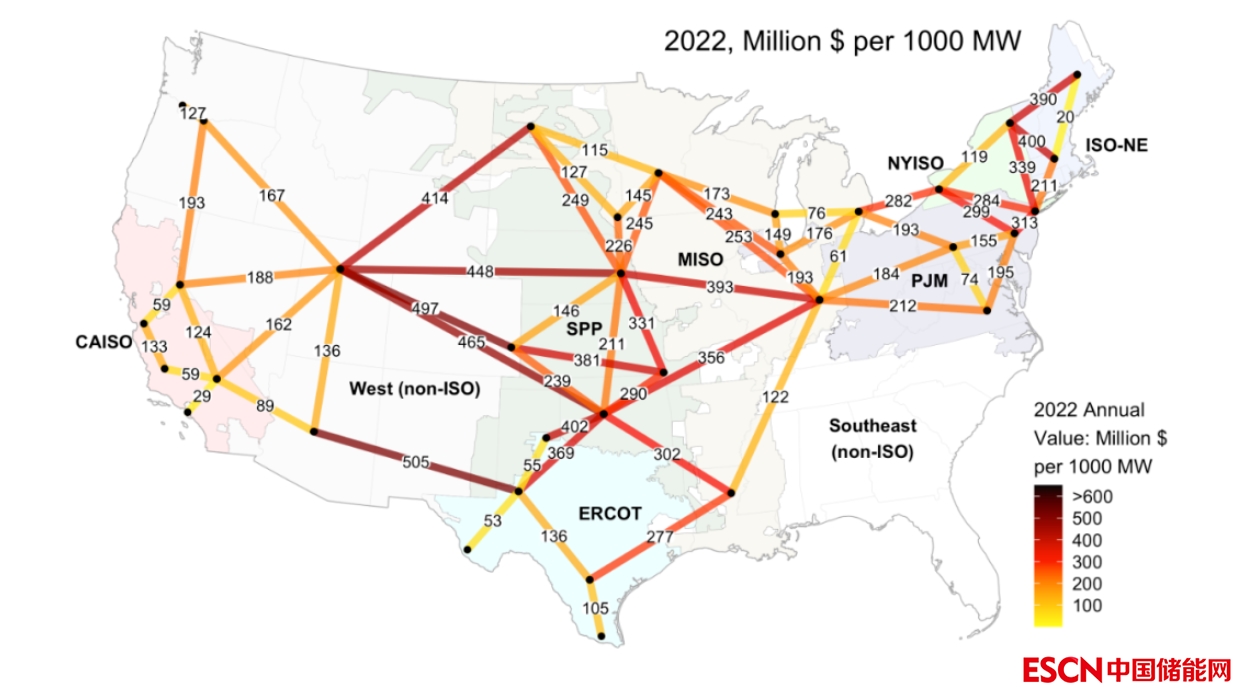 圖 1. 2022 年在許多地區(qū)觀察到高輸電價(jià)值。 顯示了假設(shè)的 1000 MW 傳輸線路的年度累計(jì)值。這些值均為邊際值(適用下一組傳輸線路容量)并且僅基于每小時(shí)的能源價(jià)格套利。請(qǐng)注意,我們無法分析定價(jià)數(shù)據(jù)有限或不可用的輸電價(jià)值,例如在非ISO東南地區(qū)。