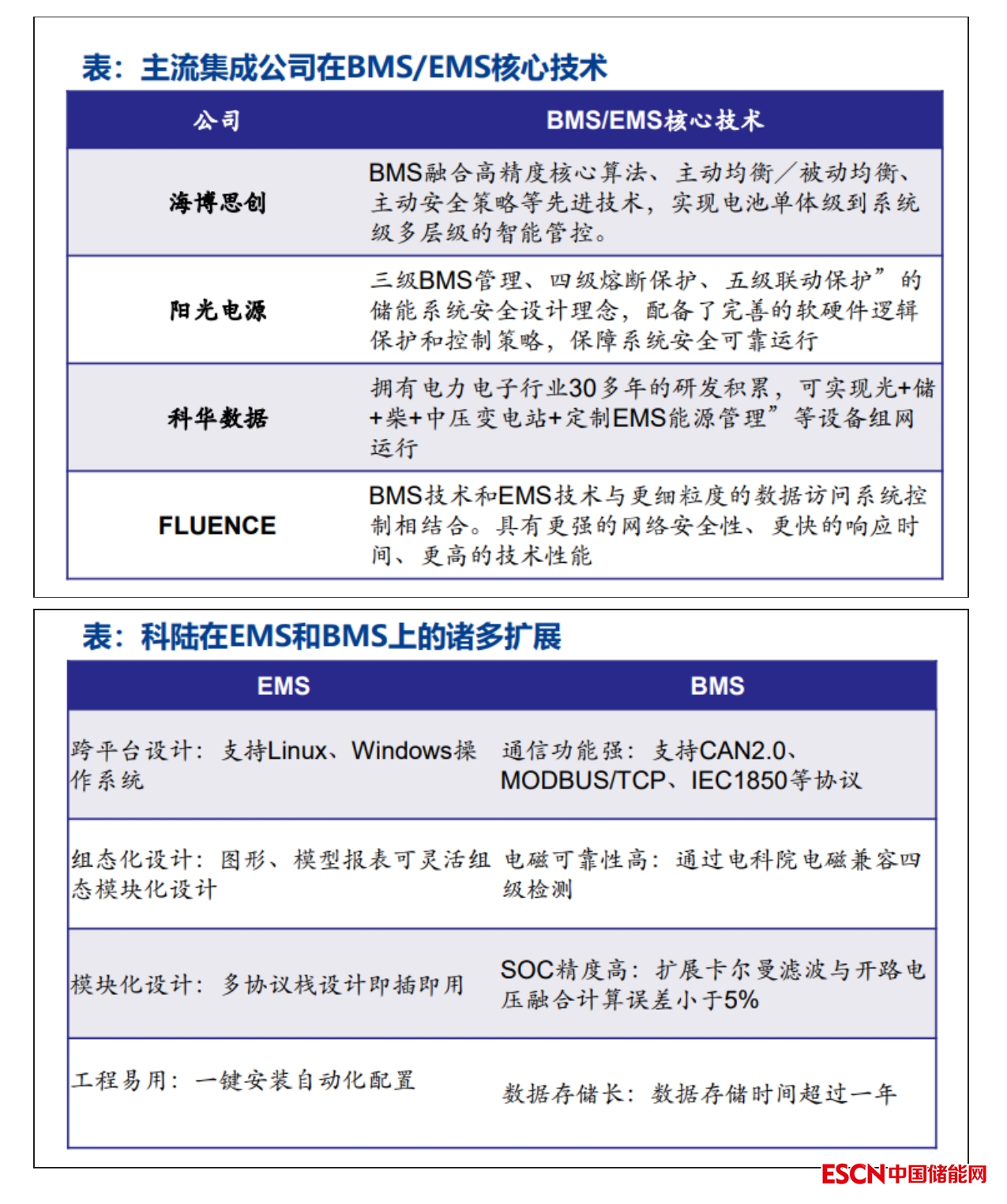 儲(chǔ)能系統(tǒng)搭建的經(jīng)驗(yàn)積累是重要因素,管理系統(tǒng)往往是自主搭建。下游應(yīng)用場(chǎng)景涉及火電廠聯(lián)合調(diào)頻、新能源配套儲(chǔ)能、電網(wǎng)側(cè)調(diào)峰、 用戶側(cè)填谷套利、無電地區(qū)微電網(wǎng)等多個(gè)領(lǐng)域,儲(chǔ)能集成環(huán)節(jié)對(duì)電網(wǎng)理解和EMS/BMS相應(yīng)能力要求較高。主流儲(chǔ)能廠商在電池和PCS方面或許可通過外采進(jìn)行配套,但涉及監(jiān)控、管理等的BMS與EMS系統(tǒng)基本都是集成廠商自主設(shè)計(jì)。
