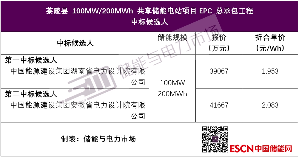 中國能源建設(shè)集團(tuán)湖南省電力設(shè)計(jì)院有限公司以總報(bào)價(jià)39067萬元,折合單價(jià)1.953元/Wh,成為第一中標(biāo)候選人。