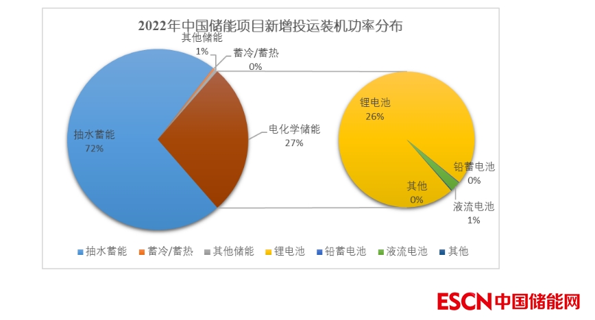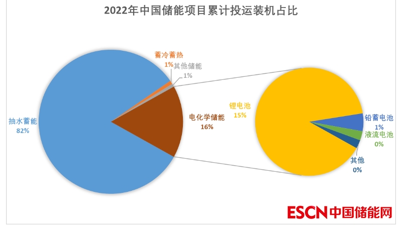 根據(jù)中國化學與物理電源行業(yè)協(xié)會儲能應(yīng)用分會統(tǒng)計,截至2022年末,我國儲能項目累計投運裝機總功率達66.493GW。其中抽水蓄能電站累計裝機功率為54.715GW,占比82.29%;電化學儲能項目累計投運規(guī)模為10.78GW,占比16.21%;蓄冷/蓄熱儲能項目累計投運規(guī)模為531.2MW,占比0.80%;其他技術(shù)儲能項目(主要指飛輪儲能、壓縮空氣和超級電容)累計投運裝機功率共465.9MW,占比0.70%。
