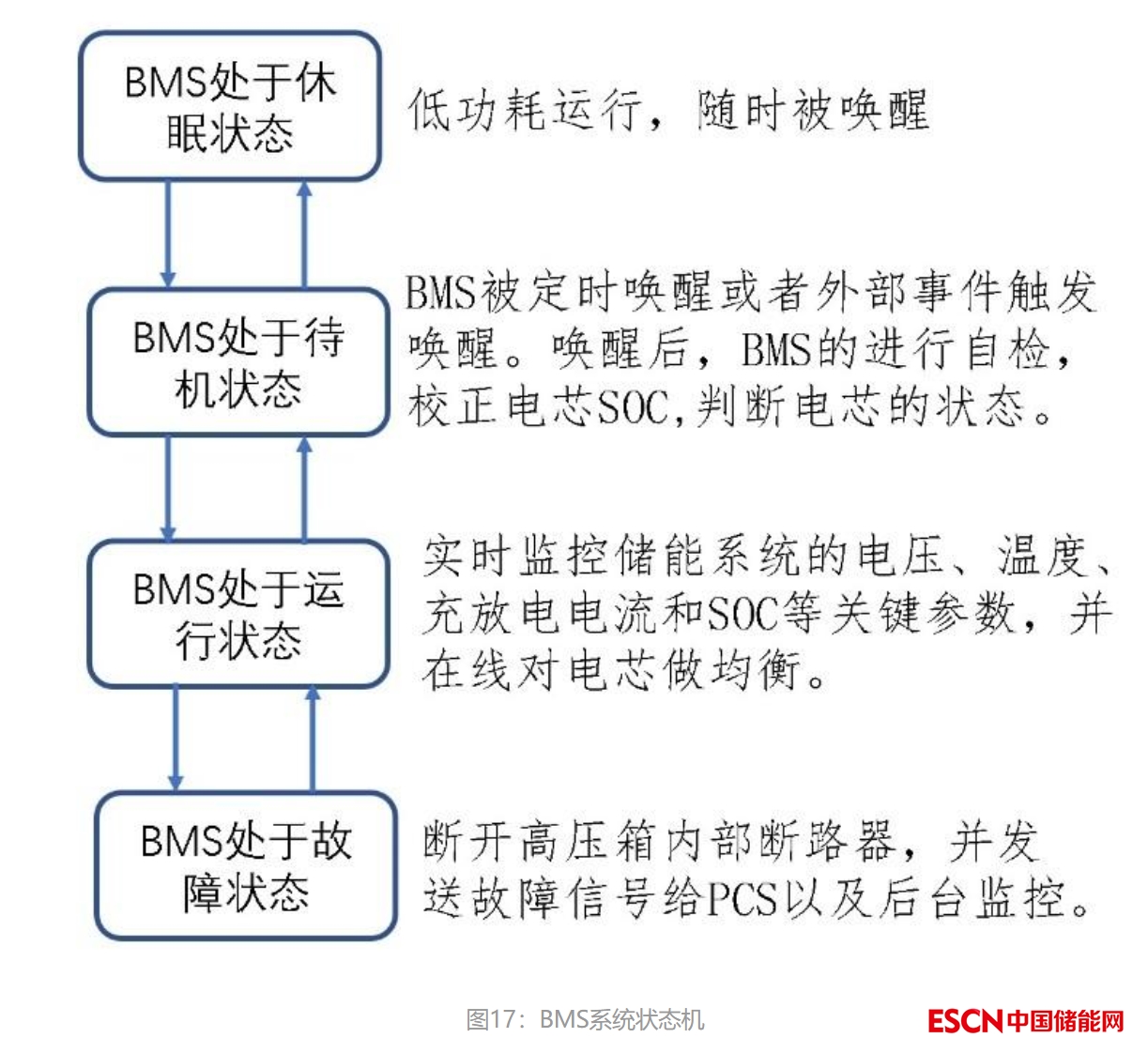 即使電池系統(tǒng)在不運(yùn)行的狀態(tài),將BMS從睡眠模式定期喚醒也是非常有必要的。一是為了更準(zhǔn)確地估計(jì)荷電狀態(tài)并對(duì)電芯做相應(yīng)的均衡;二是可以對(duì)電池進(jìn)行各種缺陷的檢測(cè),包括自放電等。圖17給出了BMS系統(tǒng)運(yùn)行狀態(tài)機(jī)的示例。