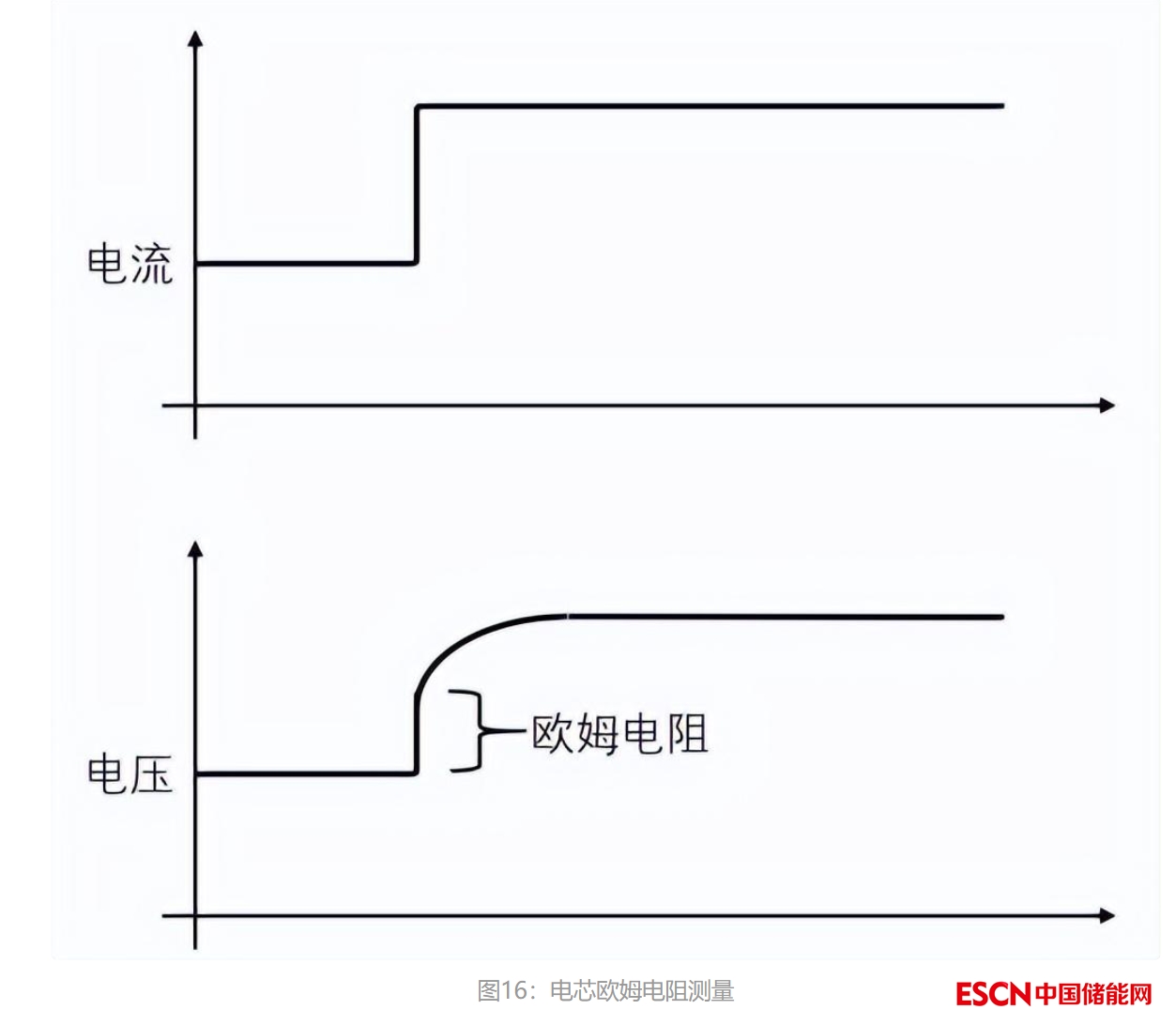此外,SOH值和內(nèi)部阻抗值存在一定的關(guān)系,可以通過測(cè)試內(nèi)部阻抗來估算SOH值。我們可以用線性最小二乘法擬合一系列電壓和電流有序?qū)Γ瑥亩@得相對(duì)比較精確的直流歐姆阻抗估測(cè)值。利用最小二乘法得出的回歸線的斜度等于阻抗,而回歸線的截距則代表非IR電壓值。此外,檢測(cè)電流的階躍變化近似值,還可以測(cè)量相應(yīng)的瞬時(shí)電壓變化。DeltaV/DeltaI的比值可用于計(jì)算該處的歐姆電阻,如圖16所示。