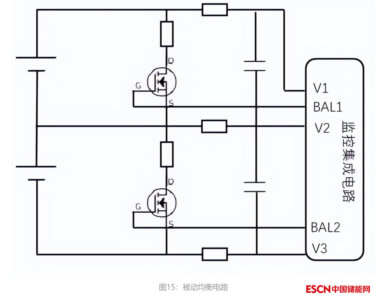 被動(dòng)均衡電路:被動(dòng)均衡電路的主要原理是將剩余電量較大的電芯自動(dòng)向電阻進(jìn)行放電,從而降低它的剩余電量,使其和其他電芯的電量趨于一致?,F(xiàn)有的監(jiān)控集成電路(AFE)采集芯片內(nèi)部都會(huì)自帶被動(dòng)均衡的功能,具體的示意圖如圖15所示。